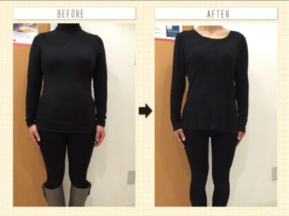 『痩せたね〜!と周りからすごく驚かれます。お洋服を選ぶ時、お腹やお尻を隠すことを考えないでコーデができるのでオシャレも楽しくなりました!!ダイエットをしながら、食事や栄養のことを学び、家族の健康にも気を使うになりました。』とAさん、ダイエットに成功され、とても喜んでおられました。