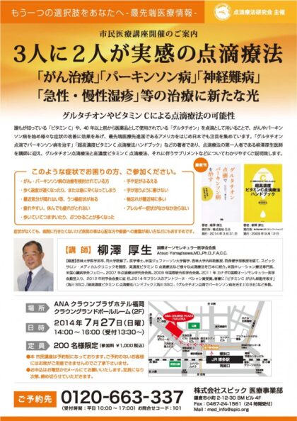 高濃度ビタミンCによるがん治療、それに伴う栄養療法についてや、4月に出版された先生の著作『グルタチオン点滴でパーキンソン病を治す』について九州地区の一般の方にも、より理解を深めてもらえるように柳澤先生の講演会が開催されます。